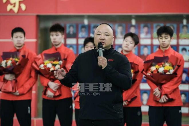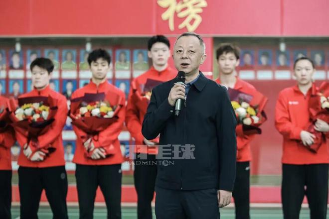 国家体育总局乒羽中心主任、党委书记高元义在讲话中表示,在这一荣耀时刻,希望全体运动员和教练员不忘初心,刻苦训练、顽强拼搏,在国际赛场上为国争光。同时,他勉励大家常怀感恩之心,感恩祖国培养、时代机遇以及父母、教练和所有默默奉献的工作人员。高元义指出,过去一年,在总局党组的坚强领导下,国家羽毛球队在世界赛场屡创佳绩,这些荣誉凝聚着全体人员的共同努力。新的一年,乒羽中心党委将继续以高质量党建引领事业发展,全力做好服务保障工作,助力中国羽毛球队再创辉煌。