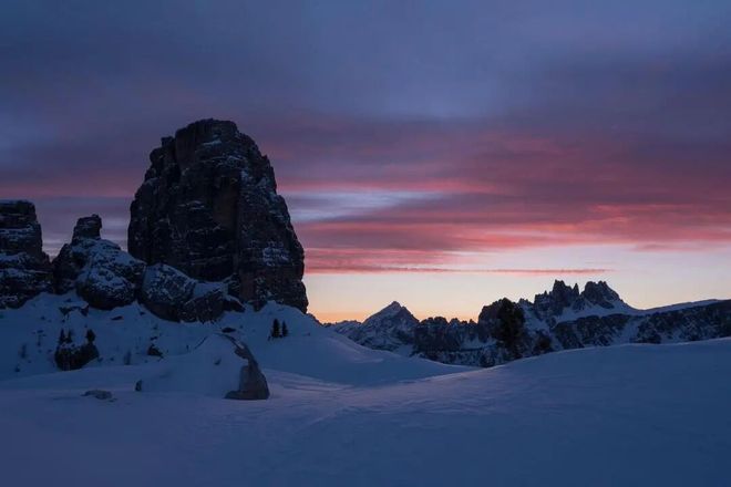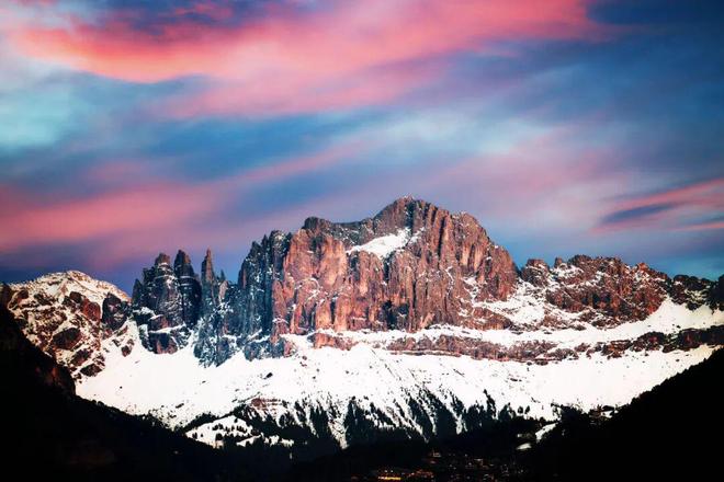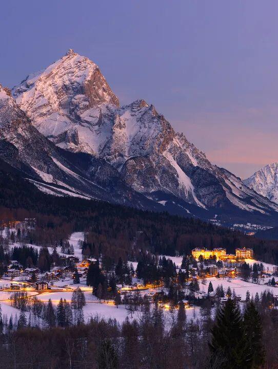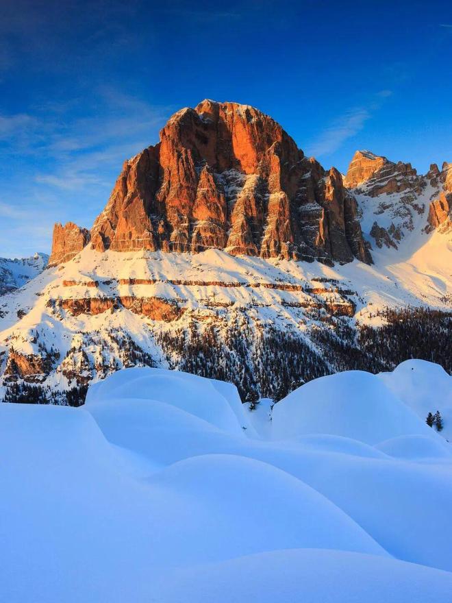 理解科尔蒂纳为何成为滑雪圣地,必须从认识多洛米蒂开始。这片山脉以18世纪法国地质学家德奥达·德·多洛米厄命名,其独特的白云岩构成了它标志性的浅色肌理,在日光下宛如“苍白山脉”。然而,自然的魔法在晨昏上演:当太阳光线低角度掠过,整片山体会被瞬间“点燃”,从柔和的粉金色渐变为炽烈的火红。这场每日两次的光影戏剧,被当地人称为 “Enrosadira”,阿尔卑斯夕照,也让这里的每一次滑行,都能邂逅粉金霞光相伴的浪漫。