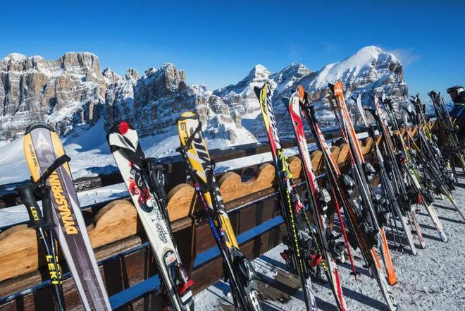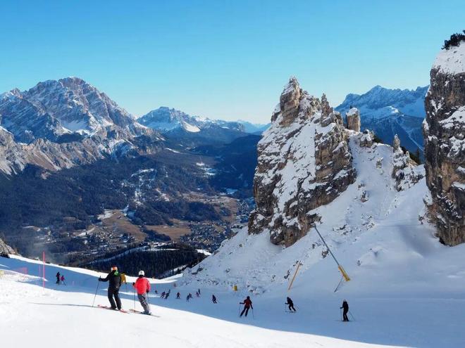 ▌科尔蒂纳丹佩佐附近滑雪场 如果说“Canalone”黑道是勇者的战场,那么五塔山全景雪道便是进阶玩家的诗与远方。五塔山因五座独立的岩体而得名,这五座岩体如同巨人的手指,直指苍穹,经过千万年的风化侵蚀,形成了独特的地质景观。全景雪道沿着山体缓缓延伸,坡度平缓适中,既适合提升滑雪技巧,又能让人从容欣赏沿途的风景。 滑行过程中,五塔山的岩体不断变换角度,时而近在咫尺,仿佛伸手可触,岩壁上的纹理清晰可见,呈现出深浅不一的褐色与灰色;时而又远在天际,与蓝天白云、皑皑白雪构成一幅浓墨重彩的油画。