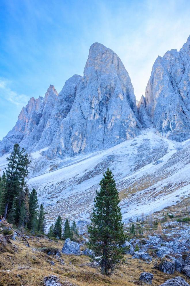 带上雪板,也别忘了在行囊里塞一双徒步鞋。科尔蒂纳还是有名的徒步圣地。富内斯山谷常被视作起点。站在圣玛格达莱纳小镇,视线自然会被身后的盖斯勒群峰牵引,岩壁如尖塔般直指天空,而前景却是缓缓展开的草甸、木屋与教堂,这一幕被誉为“阿尔卑斯山最美的明信片”。然而,本地传说给这幅美景赋予了奇幻的底色:相传这里的王国曾毁于战火,是土拨鼠从黑暗中救出了幸存者,因此土拨鼠被视为感恩的象征,徒步途中偶遇探头探脑的土拨鼠,便成了山谷赠予行者的第一份温柔邂逅。