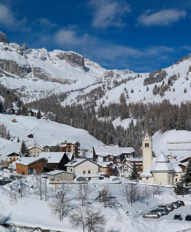 科尔蒂纳的滑雪魅力,先源于山体本身的优越轮廓。托法纳山是小镇的“门面”,从海拔3243米的顶峰到山谷,雪道自然延展,垂直落差超过千米。其次是雪质与光线的微妙关系。南坡的雪场享受着冬日阿尔卑斯的阳光,夜里寒风将雪基稳固,白天阳光轻抚,雪面微微松软,形成滑雪者梦寐以求的、如砂糖般晶亮且富有弹性的“香槟粉雪”。 再看雪场布局,整体以小镇为中心,托法纳山、五塔山和拉戈佐伊山呈扇形展开,缆车高效相连。滑雪者可轻松在一天内,从挑战冬奥历史赛道,切换到以奇幻岩峰为背景的巡航滑行,旅程本身就是一场盛宴。
