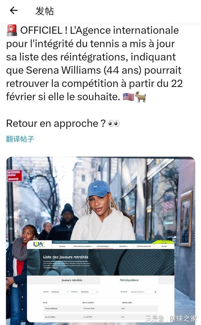 事实上,大坂直美近年来在场外的言论一直颇具话题性。从心理健康到媒体关系,她从不回避争议。此番“自嘲式”的博客计划,虽然大概率只是一句玩笑,却也让外界看到了她轻松幽默的一面。 如果说大坂直美的博客计划是轻松调侃,那么小威廉姆斯的复出消息则充满了肃杀之气。曾担任威廉姆斯姐妹早期导师的网坛名宿瑞克·马奇(Rick Macci)近日在接受采访时,谈到了弟子小威的复出计划。