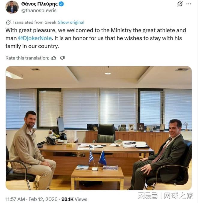 周四,希腊移民与庇护部长Thanos Plevris在X(原Twitter)上发文称,德约科维奇“希望与家人留在我们国家”,并分享了自己与这位塞尔维亚球星合影的照片,“我们非常高兴在部里欢迎这位伟大的运动员和杰出的人,他希望与家人留在我们国家,这对我们来说是一种荣幸。” 而在近日,德约科维奇在接受ANT1采访时谈到自己“感觉像个希腊人”,但也坦言语言仍是一大挑战:“我感觉自己是希腊人,但我仍然需要学习希腊语。我现在的语言水平还不够好——这并不容易。”