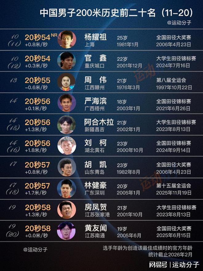 如果只看最快成绩,谢震业更是一枝独秀的存在,历史前16快成绩一度全都由他跑出。直到去年的全运会决赛,20岁小将施君豪20秒30夺冠,才占据了一个(并列)第十的位置。 当然32岁的谢震业已是生涯末期,回顾这份历史前20人榜单,“00后”正好占了一半。其中施君豪(2005)、黄友闻(2005)、刘硕元(2002)、林健豪(2005)等人,这两年都交出了不错的表现,有些成绩已比同年龄的谢震业更出色。 期待他们能持续进步。 |