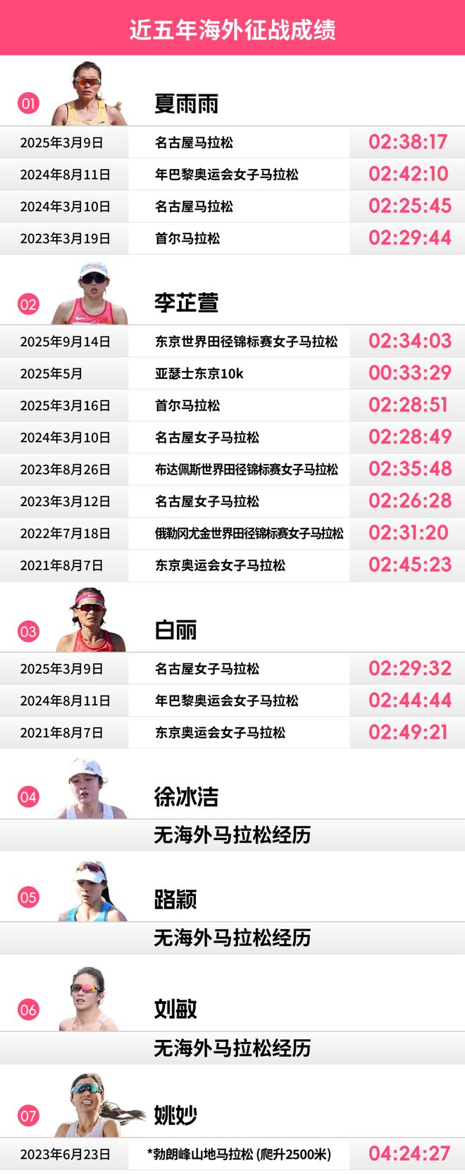 就读于清华大学体育社科学院的博士夏雨雨,在日本同样有过出色表现。2024年3月,她在名古屋跑出2:25:45,这一成绩仅次于张德顺的两次最佳,位列现役选手第三。