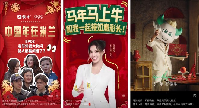 图源:蒙牛乳业 蒙牛与谷爱凌长达七年的陪伴,就是品牌“长期主义”的最佳注脚。 这背后首先源于双方“要强”的底色。早在2019年,当大多数品牌还在观望时,蒙牛便坚定选择了年仅16岁的谷爱凌。这不是一次简单的商业押注,而是 “天生要强”精神基因的深度共鸣。 其次是情感奔赴,不为金牌,只敬要强。在米兰周期,当其他广告仍在营造完美人设时,蒙牛敢将镜头对准谷爱凌的伤病复健与训练摔倒,展现“去滤镜化”的真实。TVC记录下她一次次跌倒又站起的瞬间——“摔倒了没什么,再站起来就是骨子里的要强”。 再者是内驱力,为自己、为中国而战。我们从蒙牛的系列宣传海报也能看出来,从“再战”到“王者归来”,蒙牛所致敬的也正是“骨子里要强的中国队”。从提供营养支持到传递要强精神,品牌的角色逐渐从陪伴者升华为信念的共鸣者。 当谷爱凌在米兰冬奥成功卫冕,赛后采访对着镜头喊出那句“牛牛牛,马上牛”时,屏幕前的无数观众瞬间被点燃。蒙牛也以“唯有要强,终抵冠军”回应,这标志着品牌与运动员共同向世界展现了中国新生代与中国品牌的要强力量。 场景融合:激活“春节×冬奥”双主场。 全盘看蒙牛这次春节X冬奥的营销,你会发现它玩得确实高明。要知道,品牌想在一个场景里做出声量都不容易,蒙牛却一口气把“春节团圆”和“冬奥竞技”两大国民级IP给打通了,还让它们产生了奇妙的“化学反应”,成功激活了“体育盛宴”与“家庭欢聚”交融的超级场景。 策略上,蒙牛更是玩出了新高度。它没有停留在空喊口号,而是策划了系列活动,把声量、体验和销售转化一口气全包了,形成了一个完整的营销闭环。 蒙牛以短视频矩阵精准锚定春节情感场景,打造《中国年在米兰》系列,将异国街头的暖光,化作跨越时区的情感纽带。《牛蒙蒙》则以IP化身年轻化情感载体,以萌趣动画演绎“要强”精神的日常化表达。而《动动手指,马年马上牛》的互动玩法,将春节祝福转化为社交裂变的即时参与。
