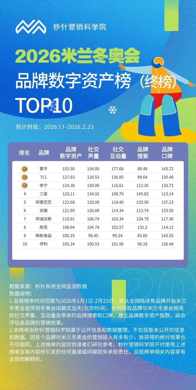 米兰冬奥完美收官,中国代表团以5金4银6铜刷新境外参赛历史最佳战绩。赛场内,是运动员们“天生要强”的拼搏战;赛场外,则是各大品牌短兵相接的营销战。 当“冬奥热血”撞上“中国年味”,这场双重叙事下的品牌大考,谁真正拿捏了国民情绪? 答案早已写在数据里:蒙牛,以绝对优势霸榜秒针《2026米兰冬奥品牌数字资产榜》,成为唯一在社交声量、互动量、口碑三个维度全面领跑的品牌。 那么,为什么是蒙牛?这背后并非一次偶然的流量爆发,而是蒙牛打出一套战略前瞻、内容共情与资源整合的“营销组合拳”,并证明了品牌营销从来不是预算堆砌,而是对情绪的精准洞察与长期主义的价值沉淀。