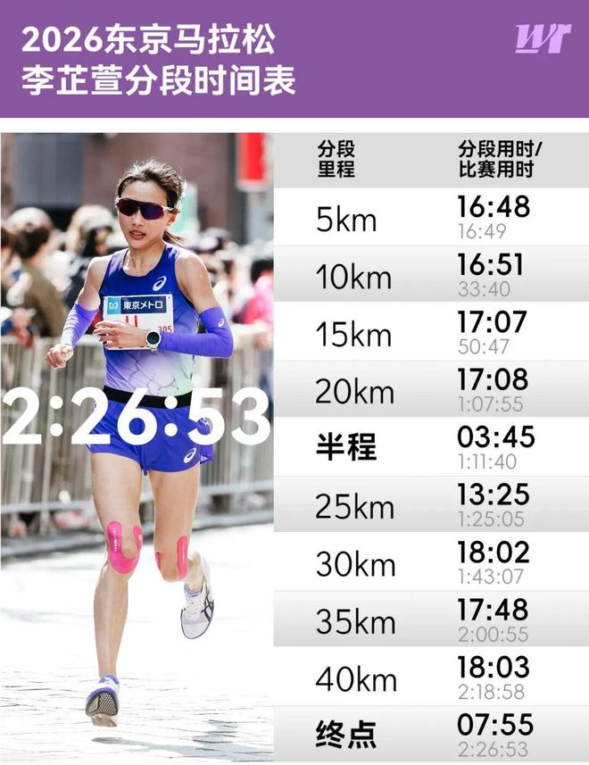 “跟腱肿了,随便跑跑,兔子都跟不住。”东京马拉松赛前,李芷萱的目标是安全完赛,别去厕所。 1月跑量549公里,2月跑量594公里,训练量的增加让她的跟腱发出了警报。 即便身体并非处在最理想状态,站上东京马拉松的赛道,李芷萱依然选择了激进大胆、极具冲击力的跑法,她从出发便用3分22的配速紧咬日本名将细田爱,10公里33分39秒,15公里50分47秒,半程用时1小时11分39秒。 30公里后,肌肉耐力不足的李芷萱出现掉速,最终,她以2小时26分53秒位列女子第13名,成为第二位冲线的中国女子选手。 尽管未能刷新PB,但在李芷萱眼中,她相信自己的巅峰还在未来。