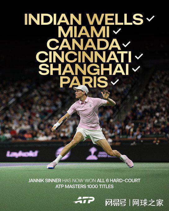 辛纳解锁全部六站硬地大师赛冠军,一纪录比肩德约费德勒