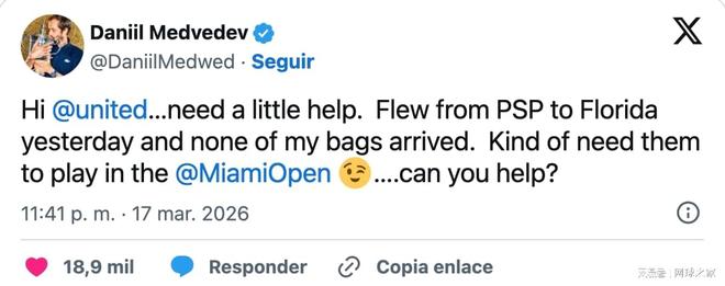 然而,在从加利福尼亚州飞往佛罗里达州后,他的行程问题打乱了备战的节奏。据梅德韦杰夫所述,他从棕榈泉国际机场飞往佛罗里达后,行李箱并未随航班抵达。据报道,遗失的行李内装有他的个人物品,而此时距离迈阿密公开赛开赛仅剩数日,这位2021年美网冠军只得求助社交媒体寻求帮助。 这位30岁的选手在社交平台X上发文,直接喊话航空公司,希望能尽快解决问题,“你好@联合航空……需要一点帮助。昨天从棕榈泉国际机场飞往佛罗里达,我的行李一件都没到。我需要这些行李参加@迈阿密公开赛……你们能帮忙吗?”