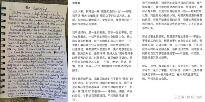 谷爱凌日记《论拥有》原文及译文 谷爱凌的这段话,直接把 “主动扛压、清醒成长” 说到了极致。而约维奇,就是把这两招完完整整学了过去。 从印第安维尔斯到迈阿密,约维奇坚持每天写日记,她像谷爱凌那样,把脑子里的想法全倾泻到纸上。输球了不骂自己,不内耗,而是冷静拆解:我刚才哪一步犹豫了?为什么会被反超?下次怎么打才能不陷入赛点危机? 约维奇把谷爱凌的 “思维拆解法” 用得明明白白:先把情绪写下来,再把问题理清楚,最后把心态调整好。一套流程走下来,纠结、焦虑、自我怀疑全被赶跑,剩下的则是专注和底气。 具备一定网球经验的人都知道,网球这个项目,真的太吃心态了。你的技术再好,一发再准,反手再稳,只要心态一崩,就全白搭。 就我十多年的打网球经历来说,我们在赛后回顾总结胜负时常常回想到比赛中的关键一分或是关键一刻,而那一分之所以决定胜负,那一刻之所以成转折点,表面上看可能是运气,实质上却是心态,所谓的 “一分崩、全局崩”。 职业选手同样也是如此。关键分、关键局、关键盘,拼的早就不是技术,而是谁更稳、谁更专注、谁不被压力吓倒。 约维奇用亲身经历告诉所有人:心理训练,和练发球、练正反手一样重要,甚至更重要。而学会写日记,学会用谷爱凌的心理分析方法分析自己,分析得失,你便能找对解决问题的策略。 从谷爱凌到约维奇,再到我们每个人,都能其中学到有用的东西。 比如,我就是这么做的。过去十多年,我几乎每次练完球、打完比赛或是阅读一本书,都会写一些长短不一的笔记,记下自己当时的感悟、心得以及收获。正是缘于这一习惯,我至今已累积了17万字的学球笔记。