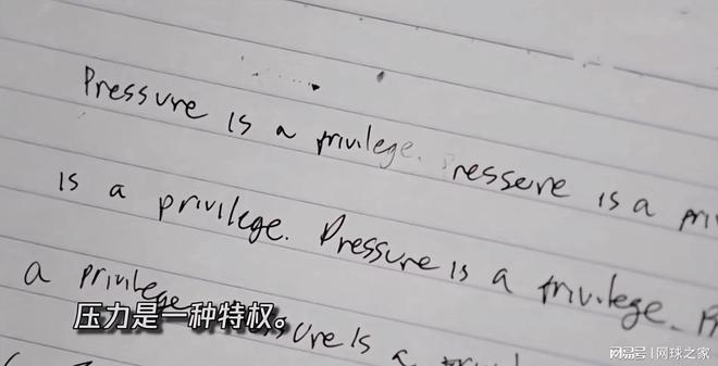 谷爱凌在日记中反复书写的“压力是一种特权” 实际上,谷爱凌这套心态大法,早就不是秘密了。纪录片《谷爱凌:再出发》里就曝光过:她在备战大赛、压力最大的时候,会一遍又一遍写下 “Pressure is a privilege(压力即特权)”,用这句话给自己打气。 网球圈的人对这句话都非常熟悉,它来自美国女子网球传奇运动员比利・简・金,这句话也被刻在了美网的阿瑟・阿什球场。 这句网球圈广为流传的话,被谷爱凌跨界引入到了滑雪界。兜兜转转,约维奇又把这句话从滑雪界引入到了网球界,用于指导自己的网球比赛。 在约维奇眼里,压力不再是折磨,不再是负担,而是你有资格站在顶级舞台、被全世界关注的证明。能感受到压力,说明你在往上走,在挑战自己的极限。 如果说“压力是一种特权”是引自别人的名言,那么接下来这段话则是谷爱凌的原创,它最近广为流传。 “我不拒绝休息,但讨厌浑浑噩噩;我不害怕安静,但拒绝停滞不前。如果注定要经历煎熬,我也心甘情愿、清清楚楚地去承受,因为这是我自己选择的人生。”——摘自谷爱凌的日记《论拥有》