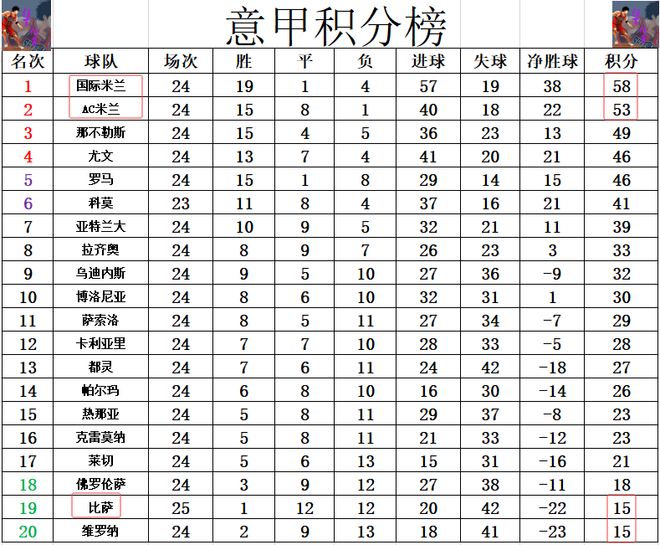 积分榜方面,AC米兰今天先赛赢球,现在他们和国米都是赛了24轮,AC米兰5分之差继续位居第2,紧追榜首的国米。那不勒斯49分排在第3,尤文,罗马46分排在第4,第5。
