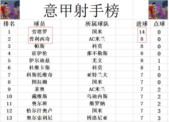 射手榜方面,劳塔罗14球继续领跑,普利西奇今天伤愈复出,只不过替补登场未能进球,还是和帕斯,霍伊伦,伊尔迪兹,杜维卡斯等人8球并列第2。 |