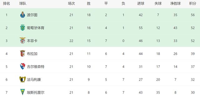 在欧冠和皇马决战之前,本菲卡在葡超顺利拿到3分。这场胜利,也帮助本菲卡在积分榜上追平了死敌葡萄牙体育。截至目前,本菲卡多赛1场,和葡萄牙体育同积52分,由于净胜球少10个,因此本菲卡继续排名第三。虽然还没能杀进前二,但是穆帅已经看到了争二的希望。只要打进前二,本菲卡就能参加下赛季欧冠。值得一提的是,波尔图近期已经2轮不胜,状态开始下滑,如今只有4分的优势,葡超争冠悬念大增,要是本菲卡能继续保持状态,未必没有逆袭争冠的希望。