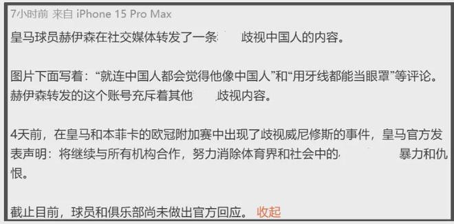 面对皇马俱乐部双标行为,中国网友愤怒了,赫伊森社媒评论区沦陷,他删除了相关动态,删除行为也意味着赫伊森了解到了舆论争议,但是依旧没有道歉。