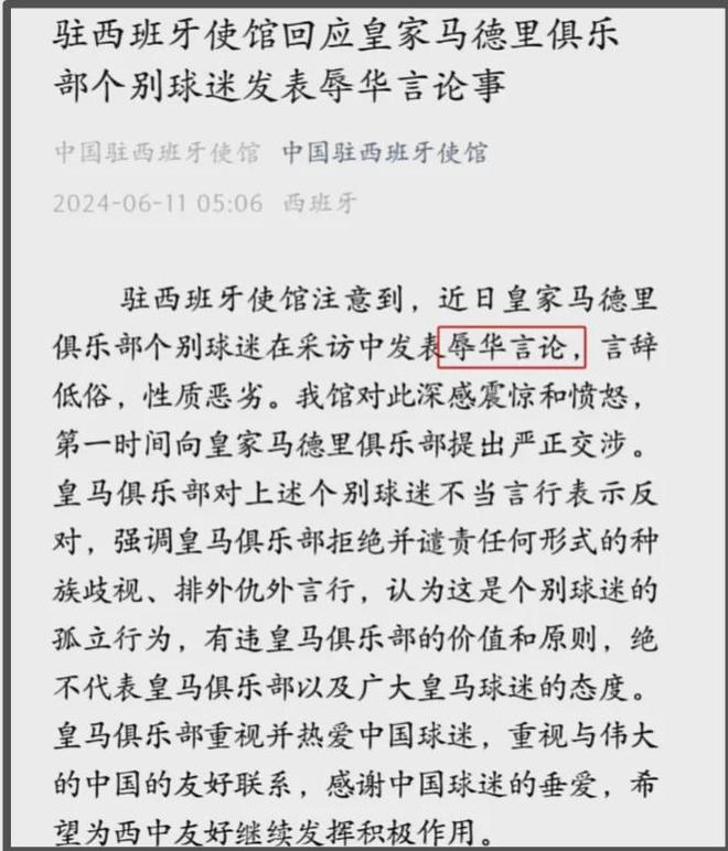 不难预料,皇马俱乐部一开始也是沉默不回应,幸亏被歧视的体育博主没有放弃,大使馆工作人员也出面帮忙,终于得到了皇马俱乐部正式回应。