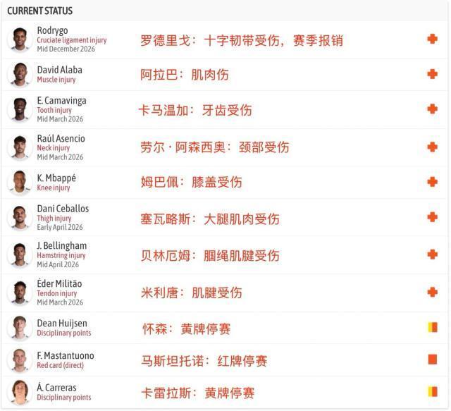 皇马攻击线在姆巴佩左膝受伤后本就威力大减,罗德里戈的重伤更如同噩耗。考虑到皇马目前的情况,姆巴佩和俱乐部以及法国国家队三方讨论后决定暂时只进行保守治疗,希望能尽快复出,但后续是否会造成更严重的后果,实在无法预料。加盟皇马前姆巴佩就因为带伤代表法国队参加欧洲杯,加盟皇马后迟迟无法找回状态。 除了姆巴佩和罗德里戈,皇马伤病名单还包括劳尔·阿森西奥、米利唐、阿拉巴、贝林厄姆、塞瓦略斯、卡马温加等人,前中后三条线都有重要主力球员缺阵,其中阿拉巴和罗德里戈一样,都是在对赫塔费一战中受伤。吕迪格则用膝盖粗野顶撞对手迭戈·里科头部,虽然比赛时逃过一劫,但赛后几乎全世界都对他进行声讨,呼吁对当值裁判停哨,对吕迪格追加停赛。