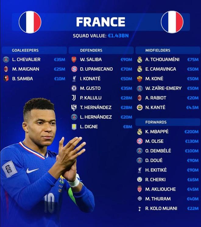 总身价:14.3亿欧元 门将 舍瓦利耶(巴黎圣日耳曼)3500万欧元 迈尼昂(AC米兰)2500万欧元 布莱斯-桑巴(雷恩)1000万欧元 后卫 萨利巴 (阿森纳)9000万欧元 于帕梅卡诺(拜仁慕尼黑)7000万欧元 科纳特(利物浦)5000万欧元 古斯托(切尔西)3500万欧元 卡卢卢(尤文图斯)2800万欧元 特奥-埃尔南德斯(利雅得新月)2800万欧元 卢卡斯-埃尔南德斯(巴黎圣日耳曼)2000万欧元 迪涅(阿斯顿维拉)800万欧元 中场 楚阿梅尼(皇家马德里)7500万欧元 卡马文加(皇家马德里)5000万欧元 夸迪奥-科内(罗马)5000万欧元 扎伊尔-埃梅里(巴黎圣日耳曼)5000万欧元 拉比奥(AC米兰)2000万欧元 坎特(费内巴切)450万欧元 前锋 姆巴佩(皇家马德里)2亿欧元 奥利塞(拜仁慕尼黑)1.3亿欧元 登贝莱(巴黎圣日耳曼)1亿欧元 杜埃(巴黎圣日耳曼)9000万欧元 埃基蒂克(利物浦)9000万欧元 谢尔基(曼城)6500万欧元 阿克利乌什(摩纳哥)4500万欧元 马库斯-图拉姆(国际米兰)4000万欧元 科洛-穆阿尼(托特纳姆热刺)2200万欧元 【上咪咕独家看英超】 |