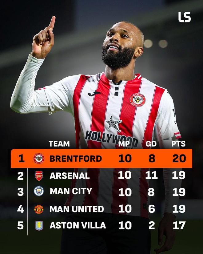 布伦特福德近10轮拿20分,同期领先阿森纳、曼城、曼联英超第1